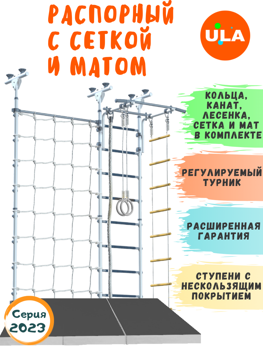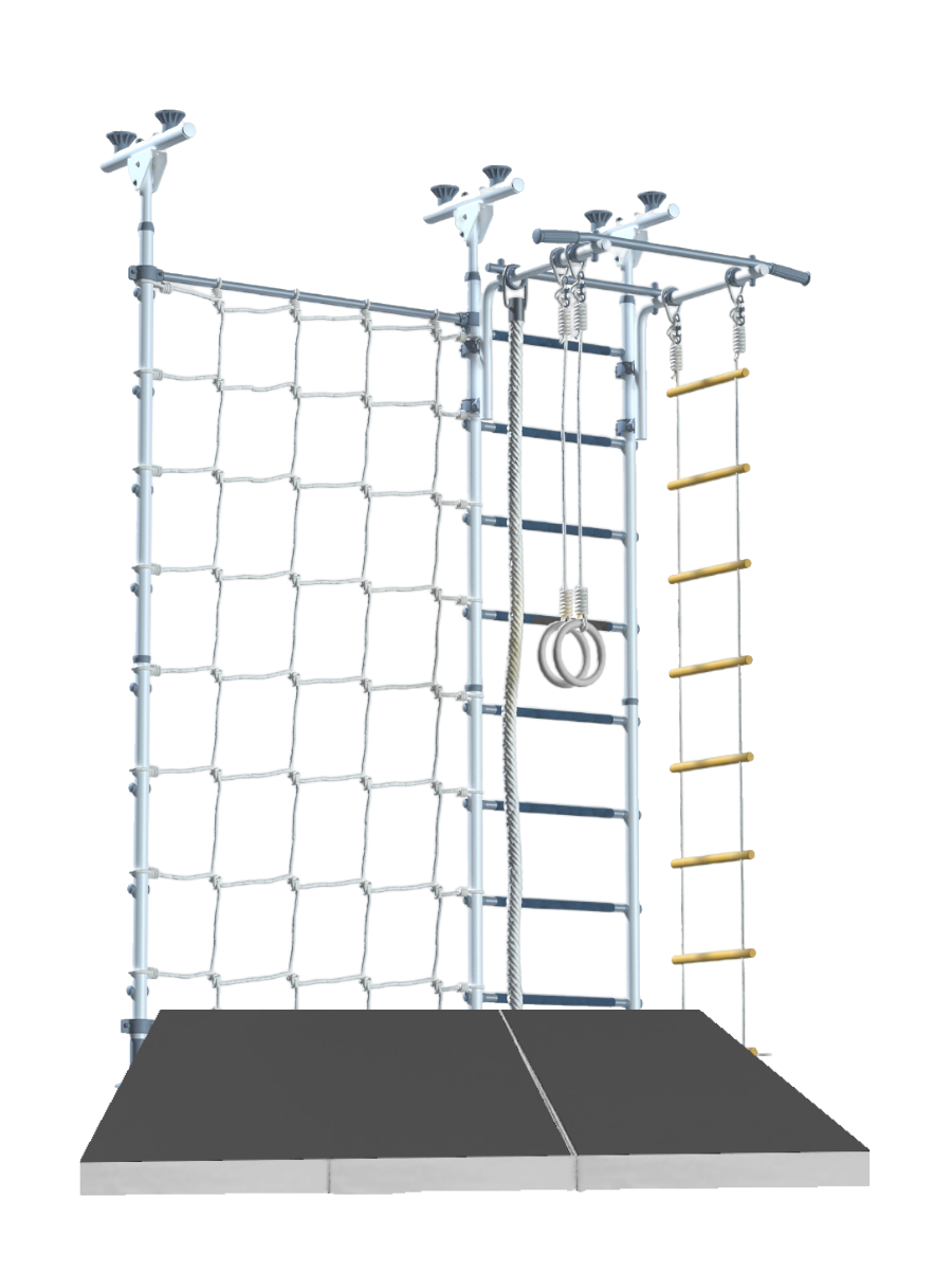 | Комплектация | веревочная лестница / гимнастические кольца / канат / мат / сетка для лазания / турник |