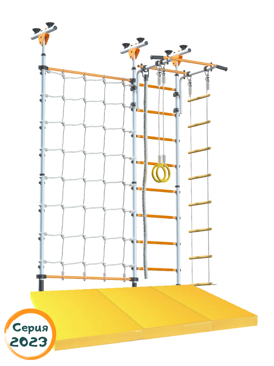 | Комплектация | веревочная лестница / гимнастические кольца / канат / мат / сетка для лазания / турник |