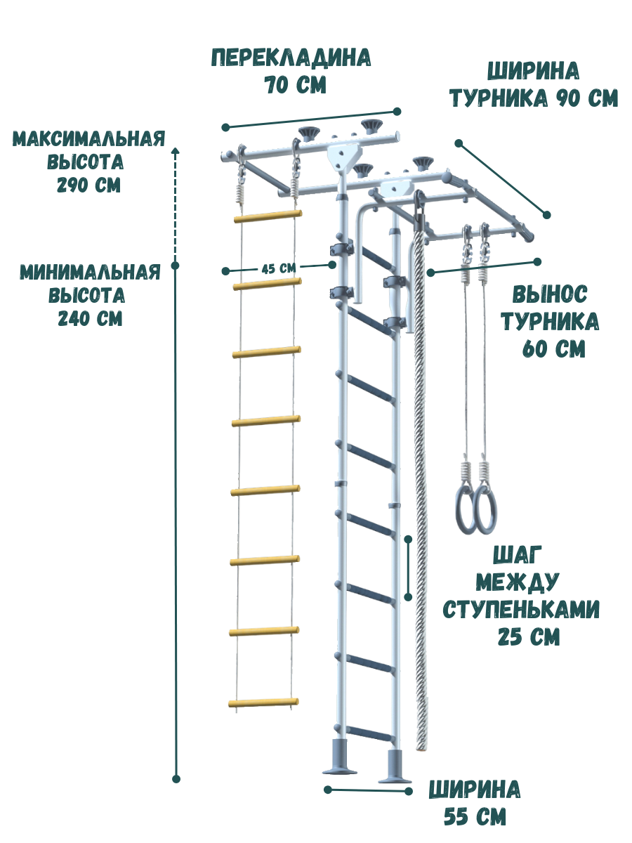 | Комплектация | веревочная лестница / гамак / гимнастические кольца / канат / мат / турник |