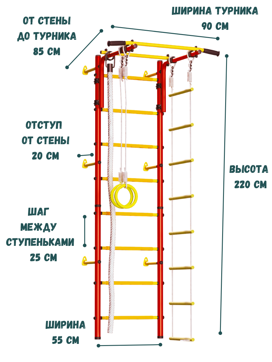| В комплекте | веревочная лестница, гимнастические кольца, канат, лестница, мат, турник |