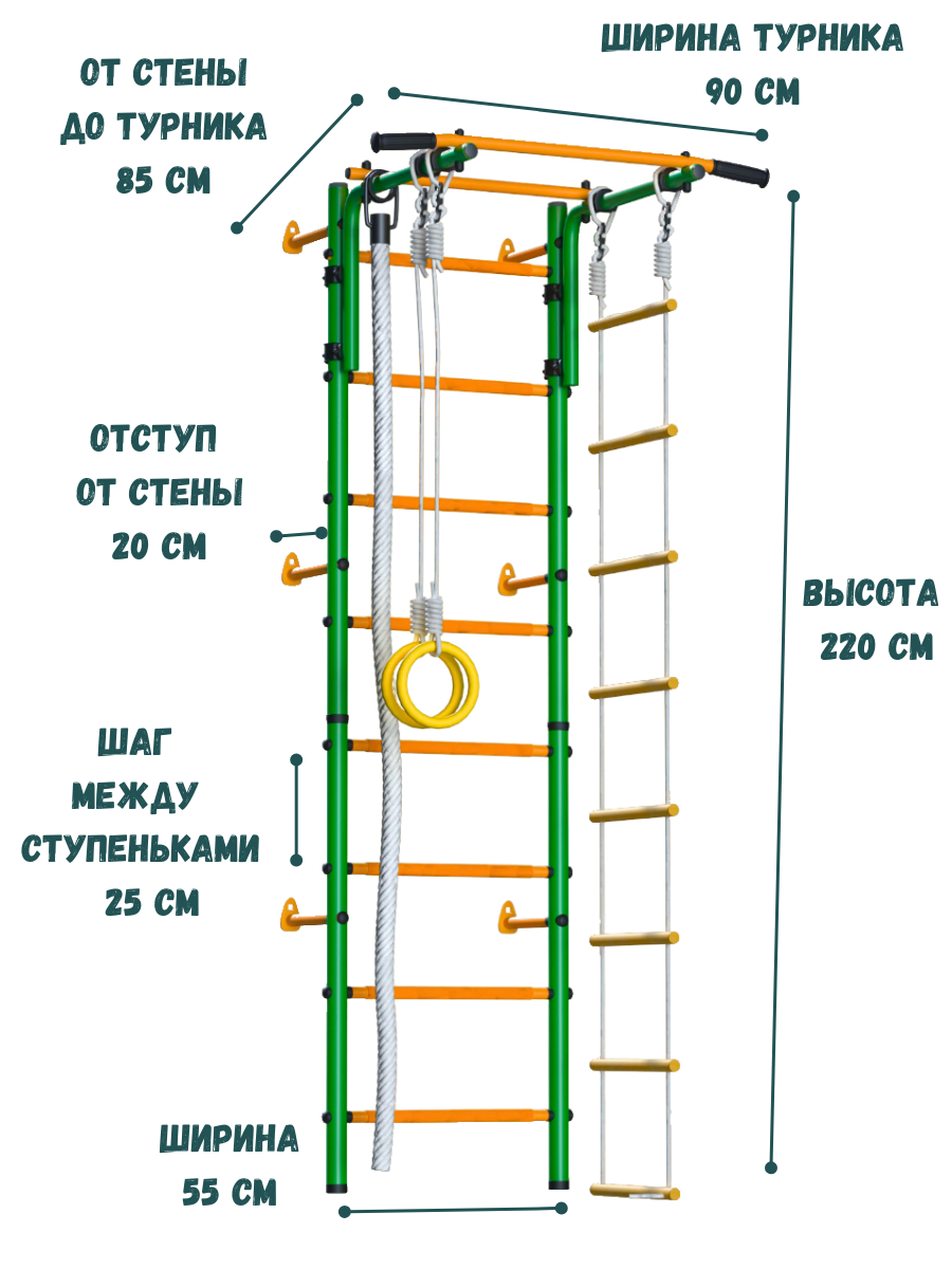 | В комплекте | веревочная лестница, гимнастические кольца, канат, лестница, мат, турник |
