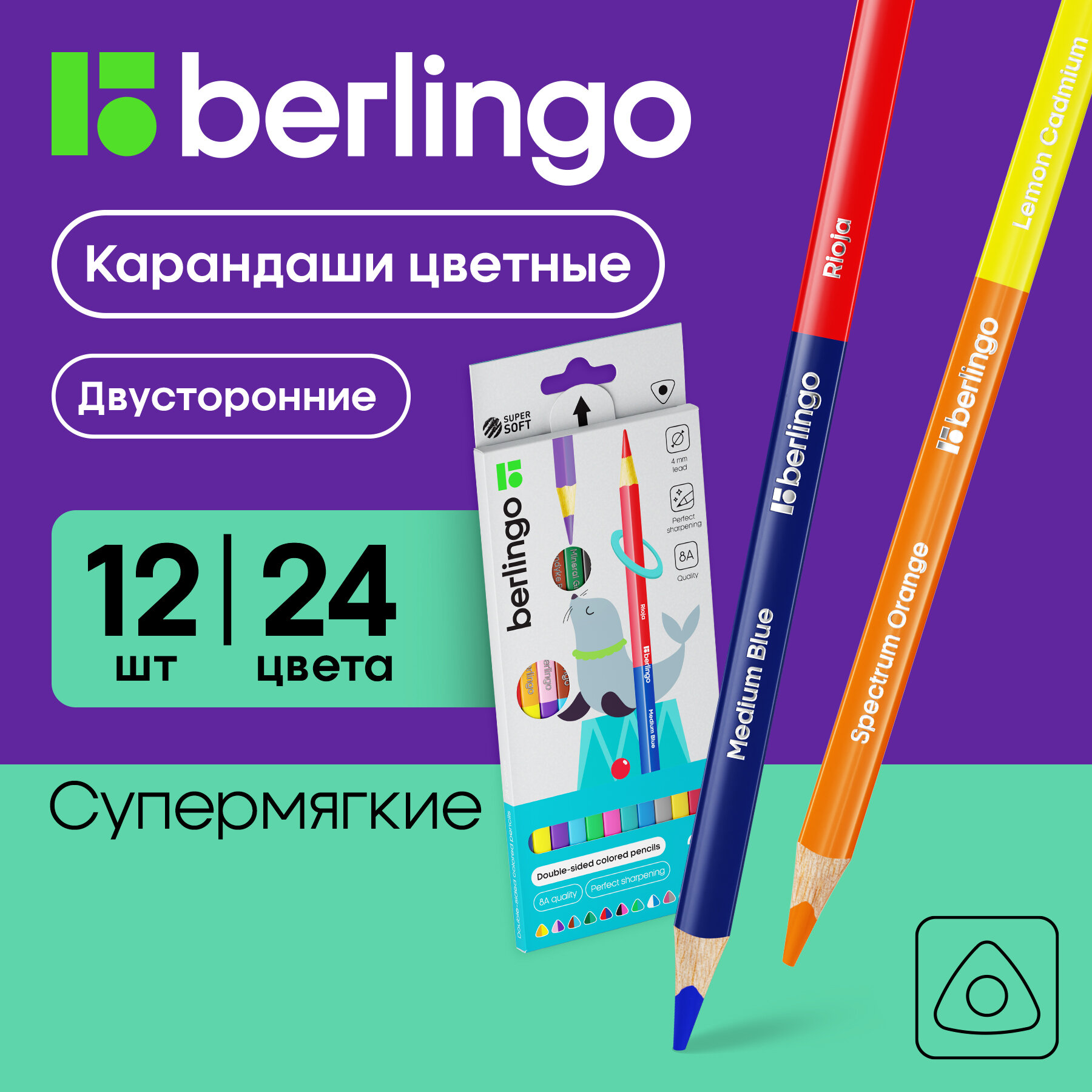 Карандаши цветные Berlingo двусторонние "SuperSoft. Duo", 24цв, 12шт, трехгр., заточ., европ.
