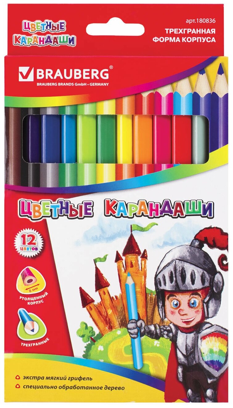 Карандаши цветные утолщенные BRAUBERG, 12 цветов, трехгранные, картонная упаковка, 180836, 1 шт