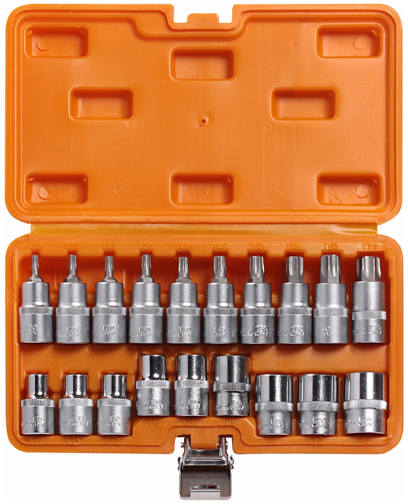 Набор головок 1/2 дюйма DR TORX E10-E24 и головок со вставками TORX T20-T70 55мм 19 шт