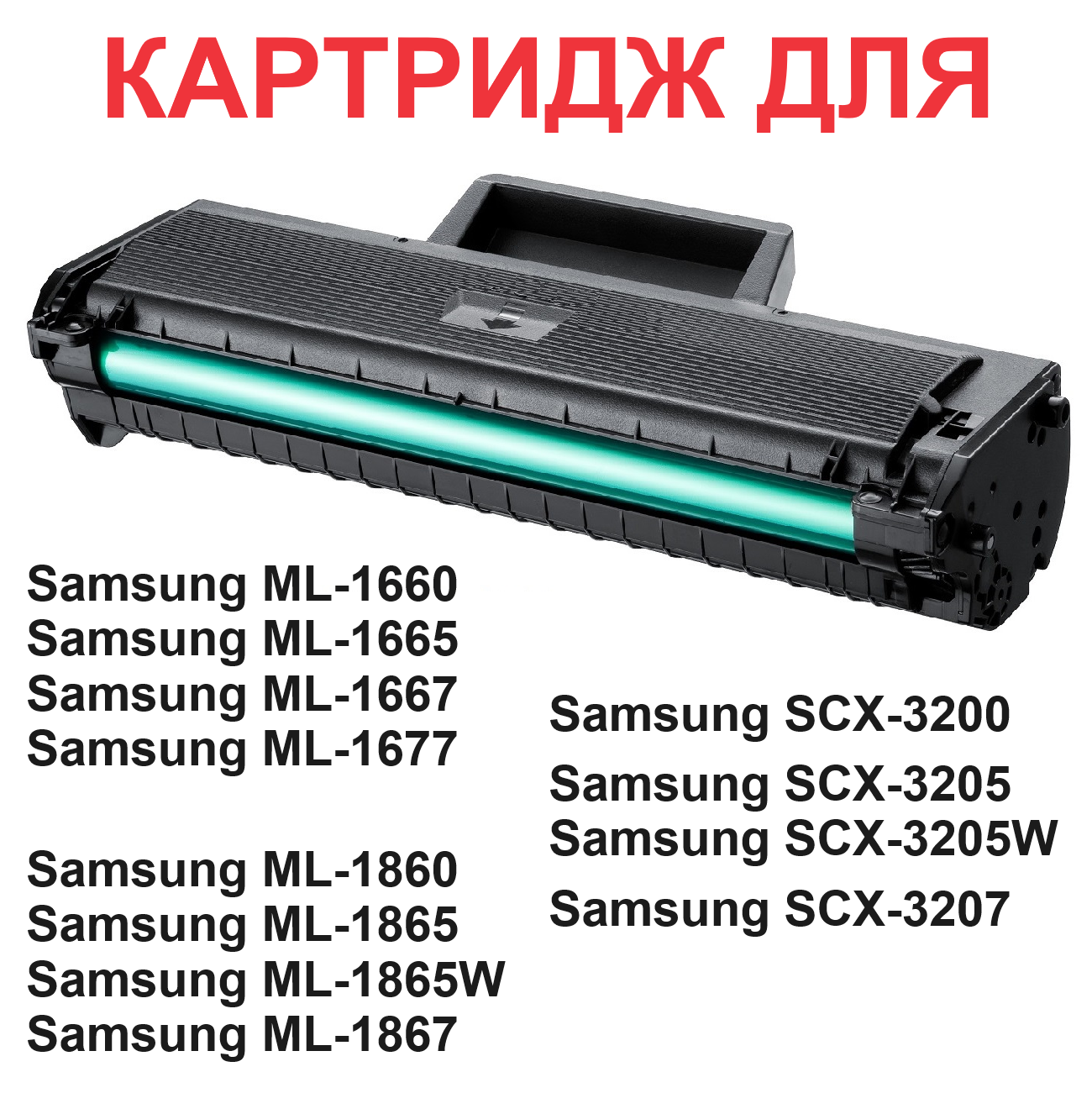 | Модель совместимого принтера | Samsung ML-1660 / Samsung ML-1665 / Samsung ML-1667 / Samsung ML-1670 / Samsung ML-1675 / Samsung ML-1865 / Samsung ML-1865W / Samsung ML-1867 / Samsung SCX-3200 / Samsung SCX-3205 / Samsung SCX-3205W / Samsung SCX-3207 / Samsung ML-1671 / Samsung ML1660 / Samsung ML1665 / Samsung Xpress SL-C1860FW |