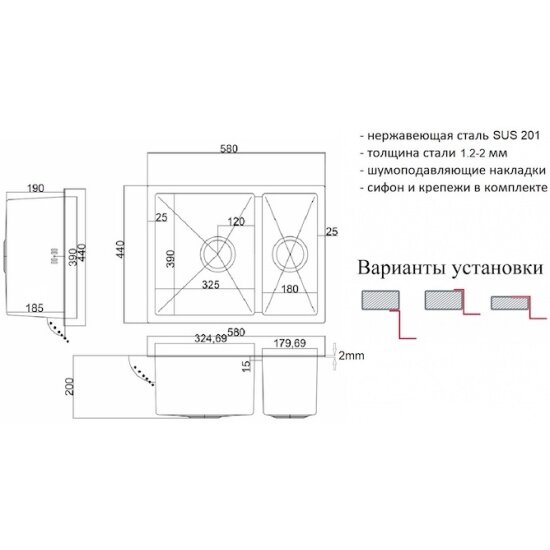 Мойка кухонная ZORG ZL R 580-2-440 GRAFIT две чаши, оборачиваемая, графит черная, толщина 1,2 мм интересное: