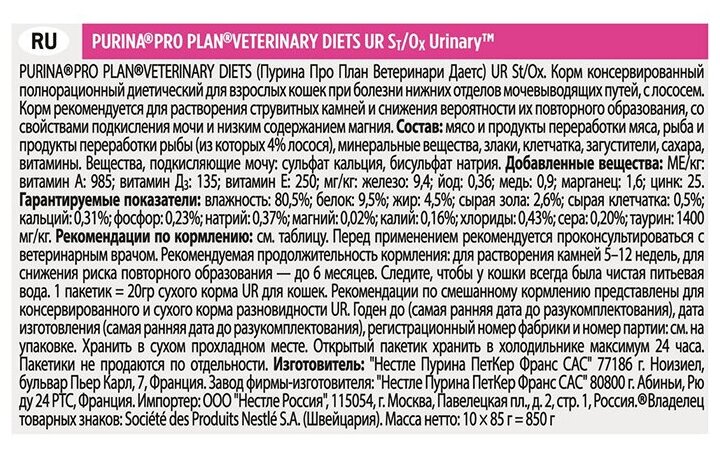 Корм PRO PLAN VETERINARY DIETS UR для кошек при болезнях нижних отделов мочевыводящих путей, c лососем 10шт,*85 г