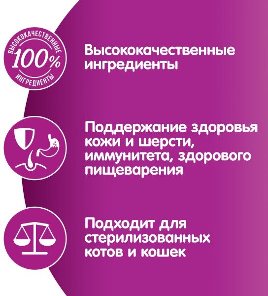 | Состав | злаки и продукты их переработки, мука животного происхождения (в том числе из индейки), растительные белковые экстракты, животные жиры и растительные масла (в том числе подсолнечное масло и рыбий жир), гидролизат из продуктов животного происхождения, свекловичный жом, минеральные вещества, витамины, пивные дрожжи, молочные продукты ( в том числе сухое молоко), красители, аминокислоты (в том числе таурин), морковь сушеная, антиоксиданты |