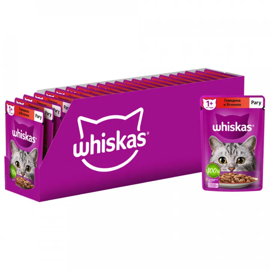 Купить Корм влажный Whiskas полнорационный для взрослых кошек, рагу с говядиной и ягненком, 28шт х 75г