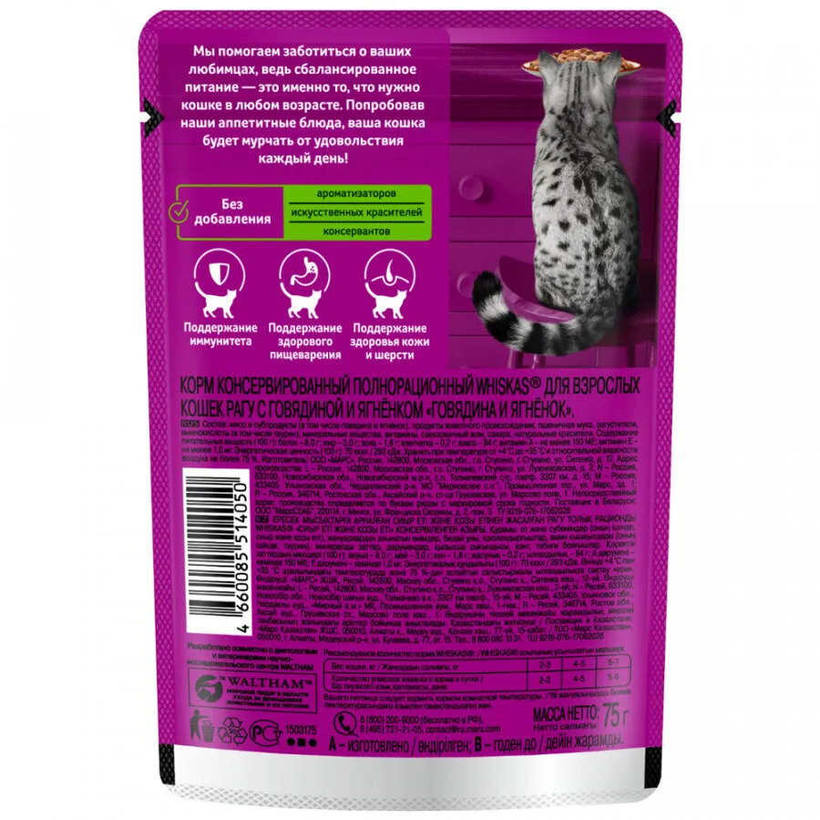 Whiskas пауч для кошек (рагу) Говядина и ягненок, 75 г. упаковка 28 шт