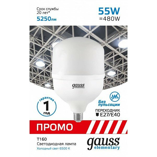 Лампа Gauss Elementary T160 55W 5250lm 6500K E27/E40 Promo LED 60436 интересное: