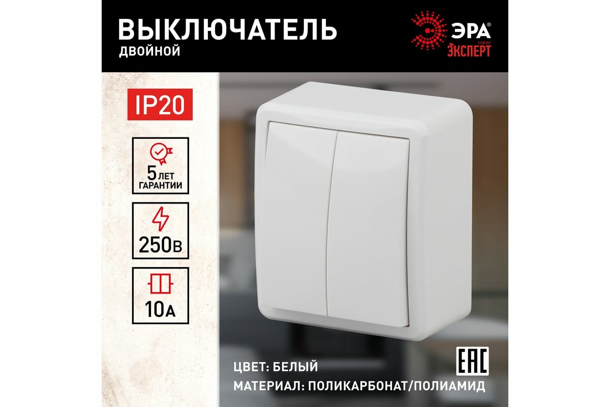 Купить ЭРА 11-1204-01 Выключатель двойной, 10АХ-250В, IP20, ОУ, Эксперт, Белый