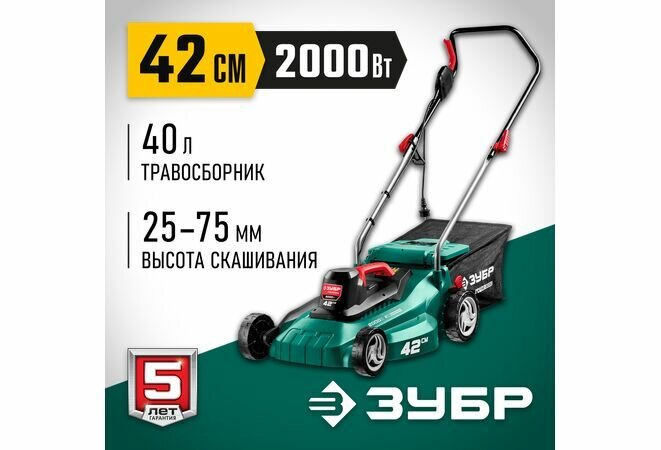 1 Газонокосилка сетевая ЗУБР ГСЦ-42-2000, 2000 Вт, 3200 об./мин, ширина скашивания 42 см, ГСЦ-42-2000