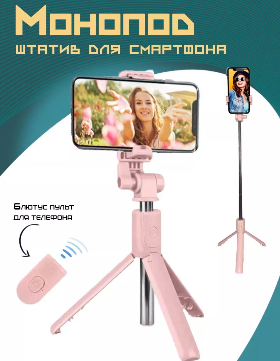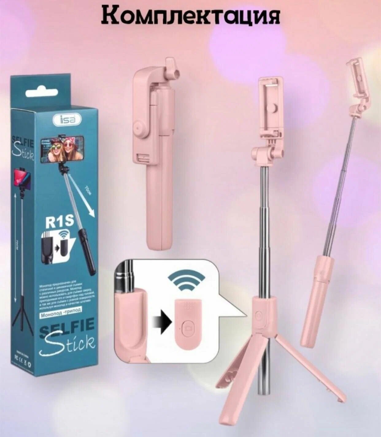 Купить Монопод-трипод для селфи с Bluetooth пультом ISA R1S розовый / Селфи палка со съемным блютуз пультом