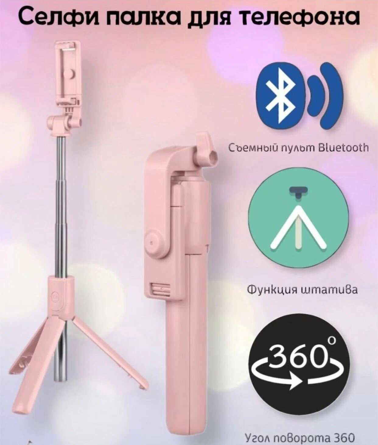 Монопод / Трипод / Селфипалка с Bluetooth пультом R1S / Монопод для селфи / розовый