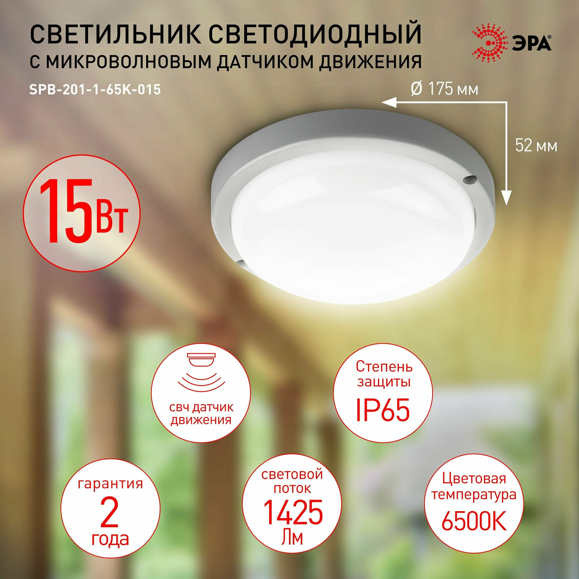Светильник ЖКХ светодиодный ЭРА SPB-201-1-65K-015 IP65 15Вт 1425Лм 6500К СВЧ с датчиком движения