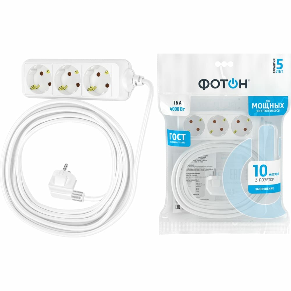 Удлинитель сетевой для розетки фотон 16А 10м 3 розетки с заземлением белый, ГОСТ