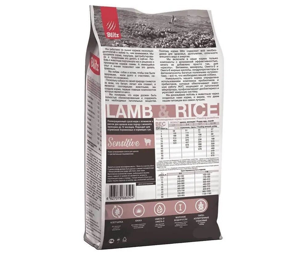 Корм сухой для щенков BLITZ Sensetive Puppy с ягненком и рисом, 15 кг