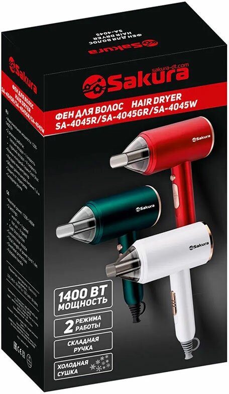 Фен Sakura SA-4045W, 1400Вт, 2 температурных режима, 2 скорости, белый, 1 шт.