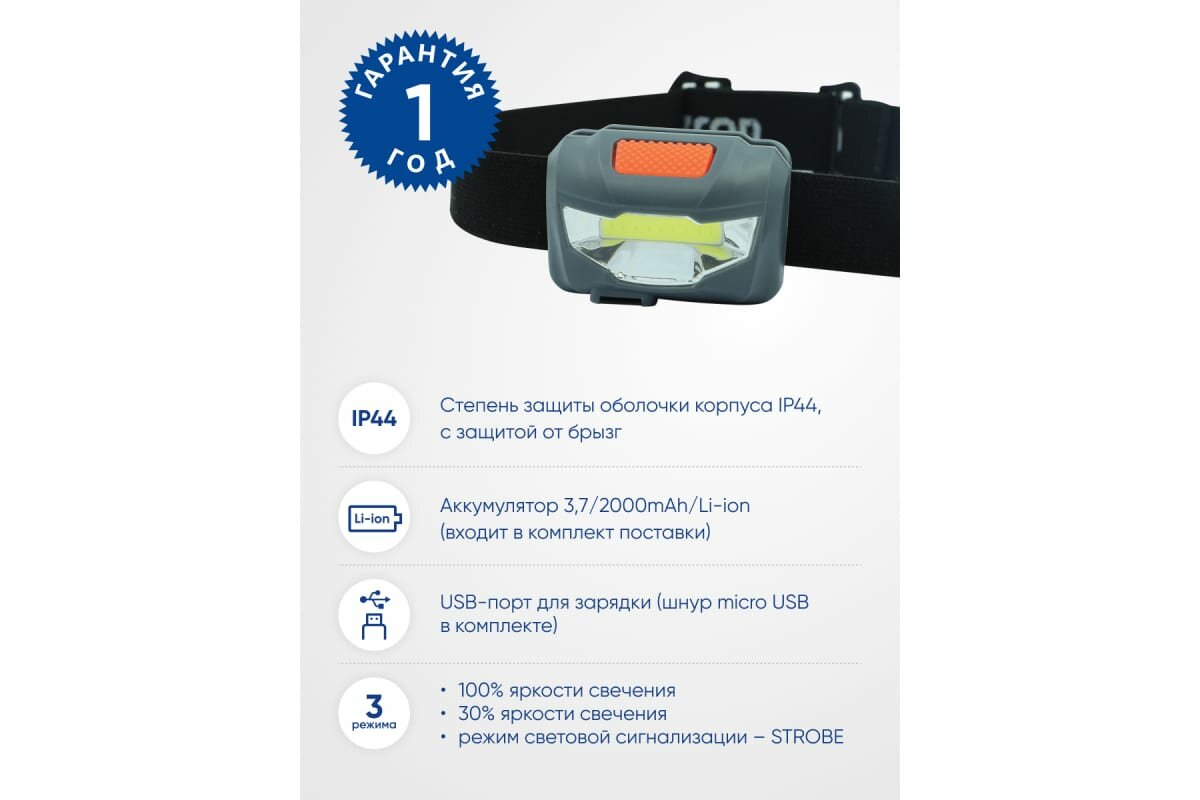 Фонарь налобный Feron TH2301 с аккумулятором 3W 1COB USB IP44, пластик (арт. 41680)