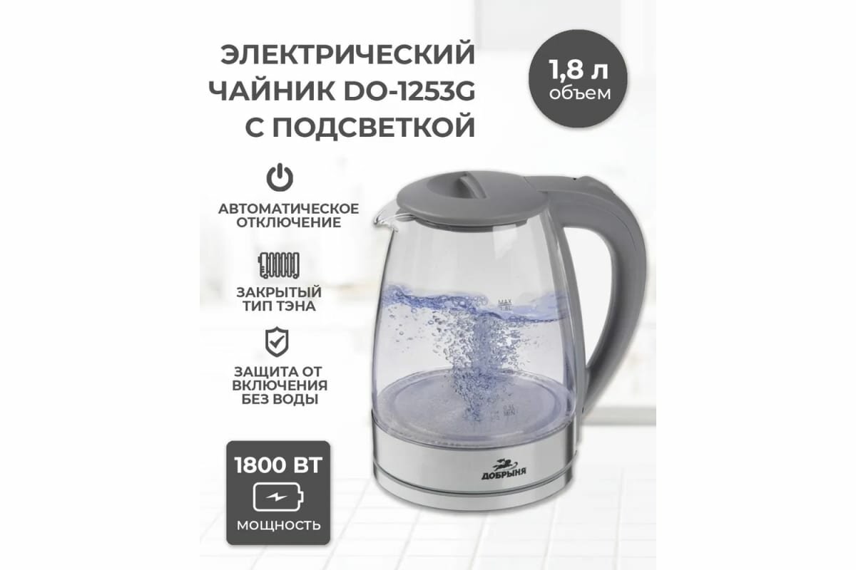 Чайник стеклянный 1.8л серый 1800Вт DO-1253G Добрыня (1/12)