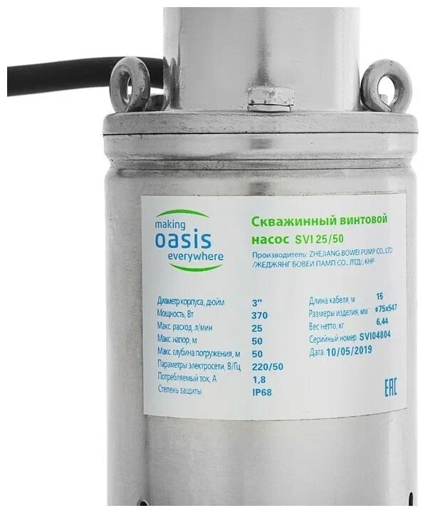 Насос погруж винт, Oasis, 15 м, 370 Вт, d75 мм, погруж50 м, напор50 м, 1.5 м³/ч, 25/50