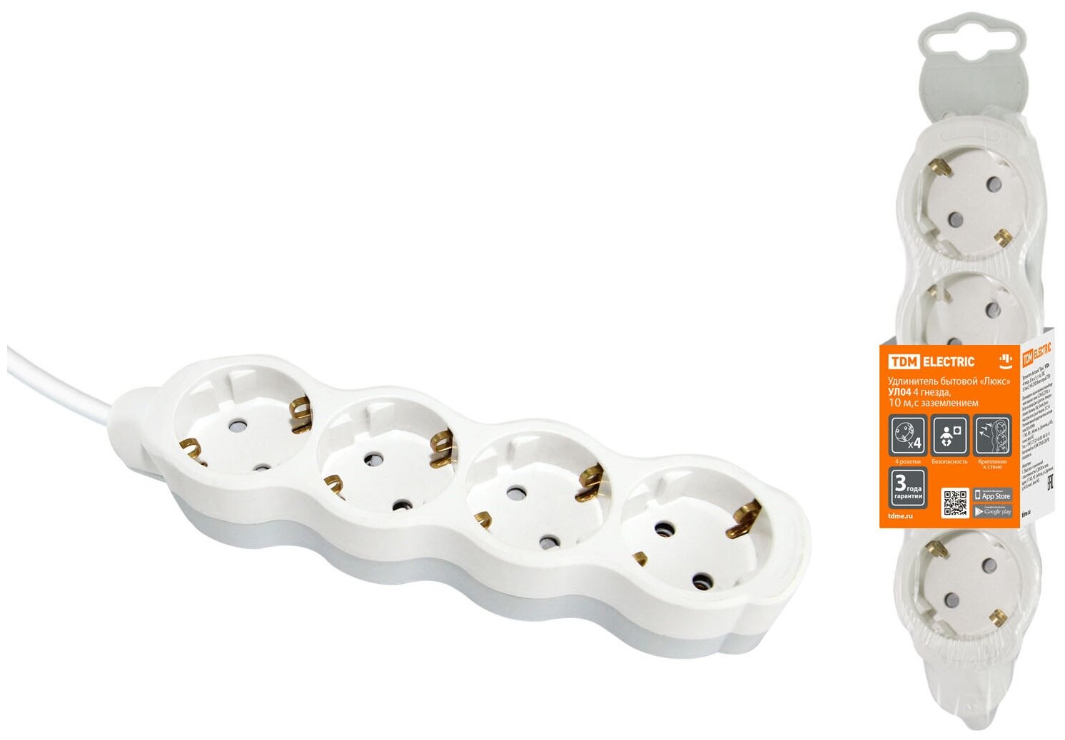 TDM SQ1303-0284 Удлинитель бытовой "Люкс" УЛ04 4 гнезда, 10м, с/з, с з/ш, ПВС 3х1мм2 16А/250В бело-с .