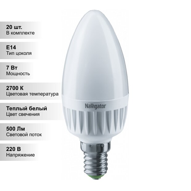 Купить (20 шт.) Светодиодная лампочка Navigator C37 7Вт 230В 2700K E14