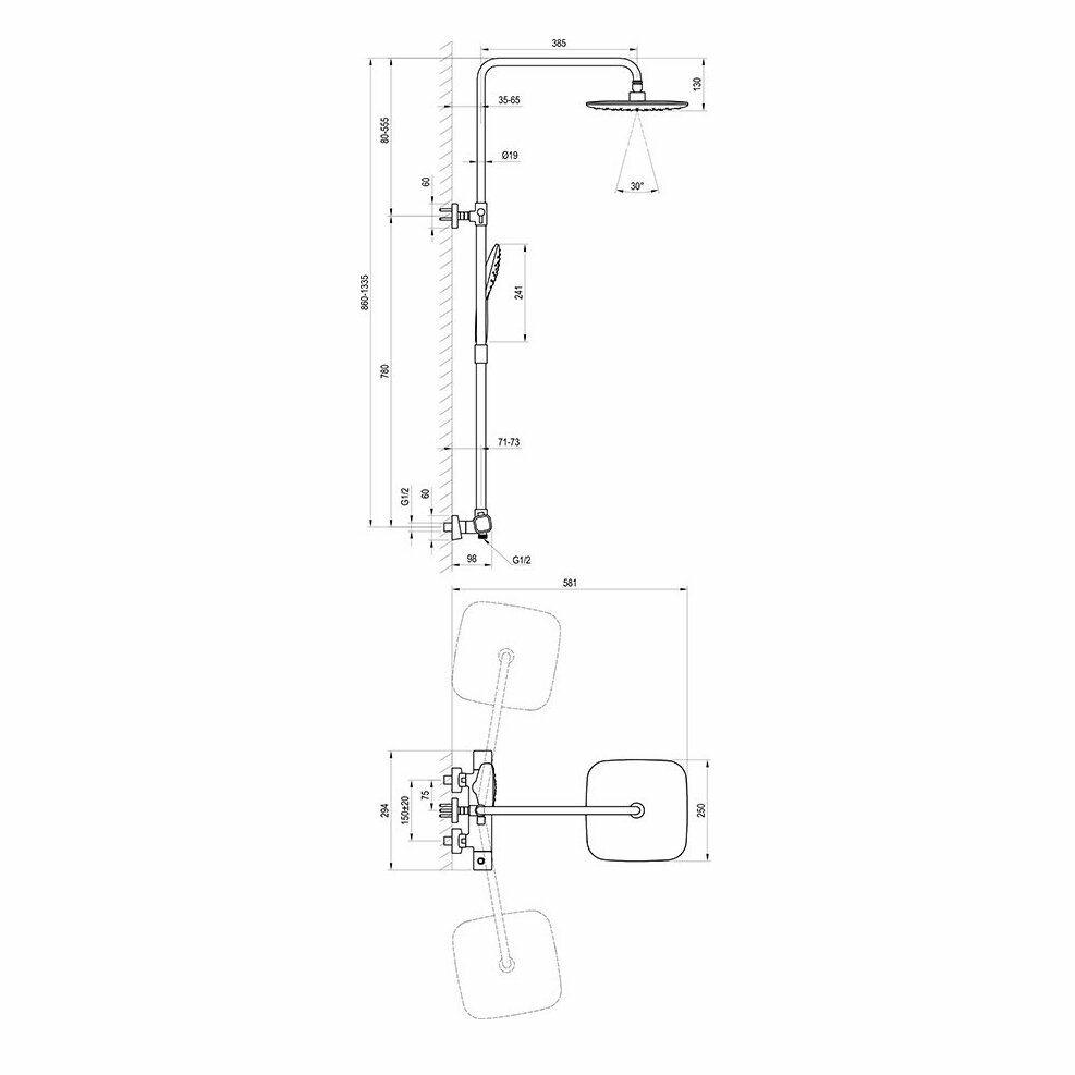 | Дополнительная информация | высота стойки для душа: 1335 мм; длина верхнего душа: 250 мм; ширина верхнего душа: 250 мм |