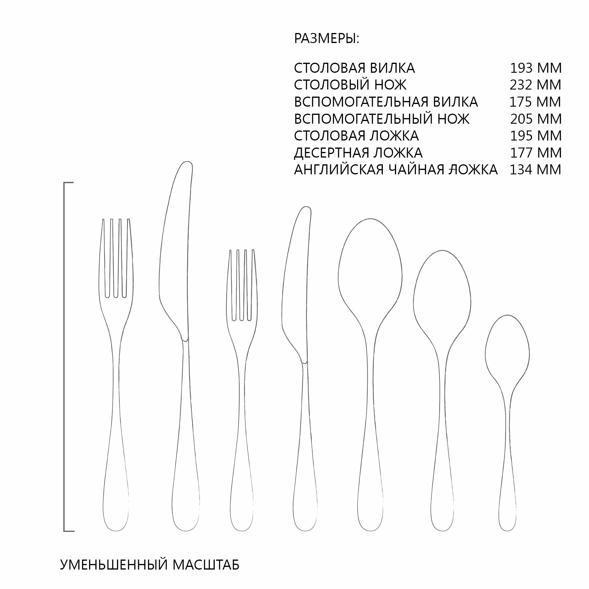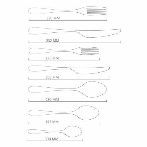 | В набор входит | ARDBR1001L — 6 столовых ножей 24 см, ARDBR1002L — 6 столовых вилок 20 см, ARDBR1003L — 6 столовых ложек 20 см, ARDBR1004L — 6 десертных ножей 21 см, ARDBR1005L — 6 десертных вилок 18 см, ARDBR1006L — 6 десертных ложек 18 см, ARDBR1007L — 6 чайных ложек 14 см |