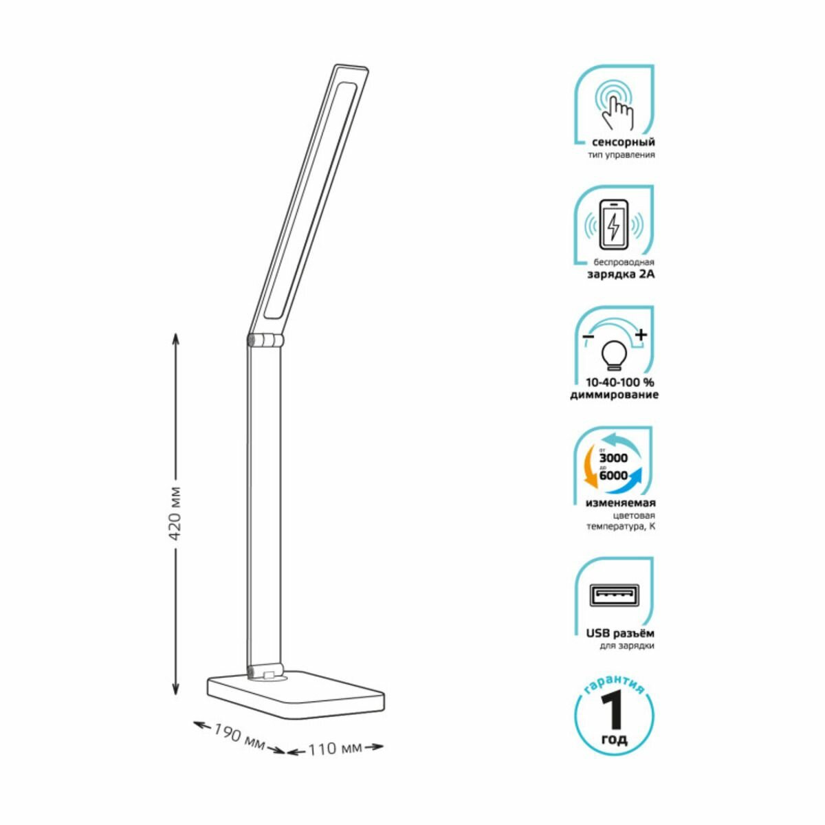 Светильник настольный Qplus GTL501 10W 600lm 3000-6000K 170-265V белый диммируемый Qi USB LED