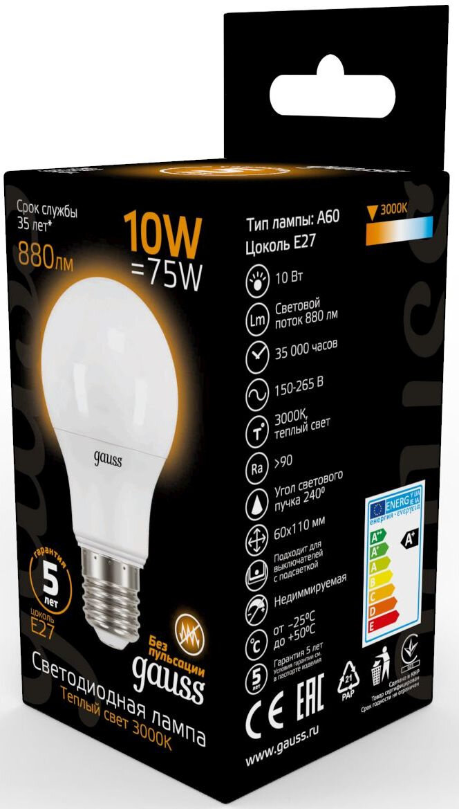 Упаковка светодиодных ламп 10 шт. gauss 102502110, E27, A60, 10Вт, 3000 К