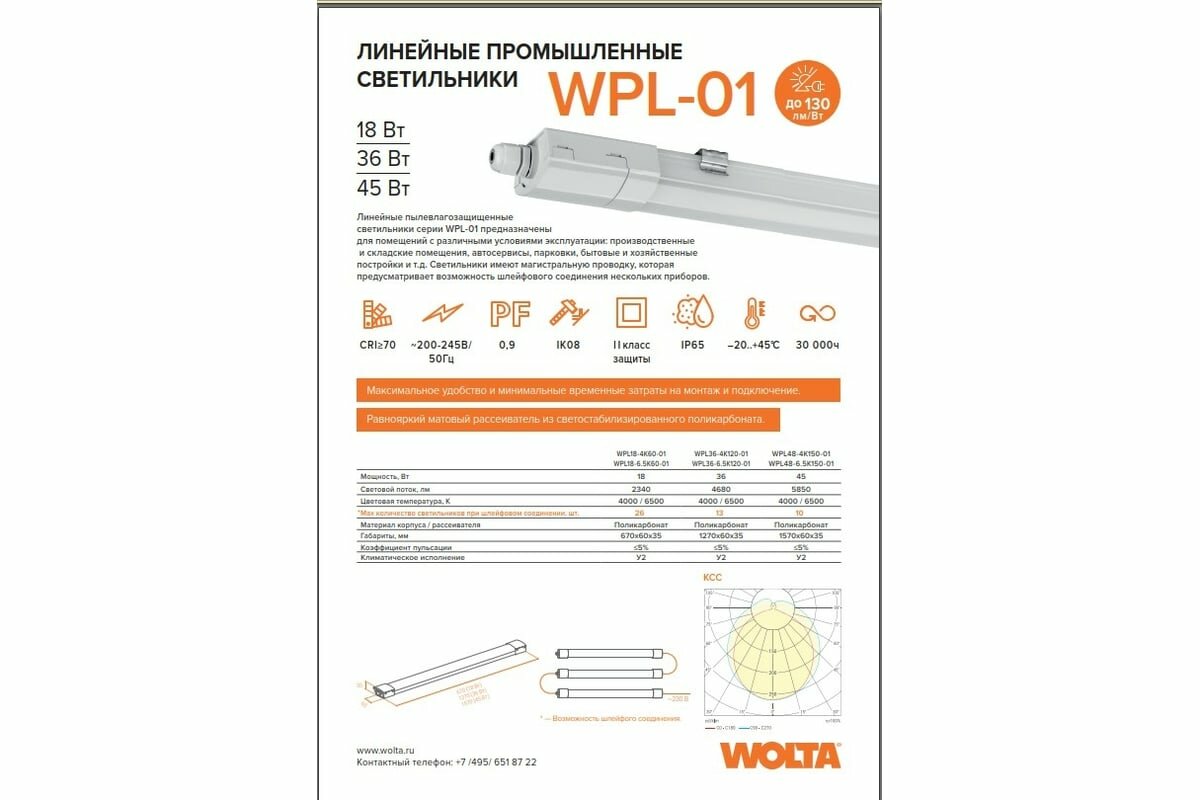 Wolta Светодиодный светильник 18Вт , 4000К Дневной белый свет , IP65 , IK08 , Накладной / Подвесной WPL18-4K60-01 интересное: