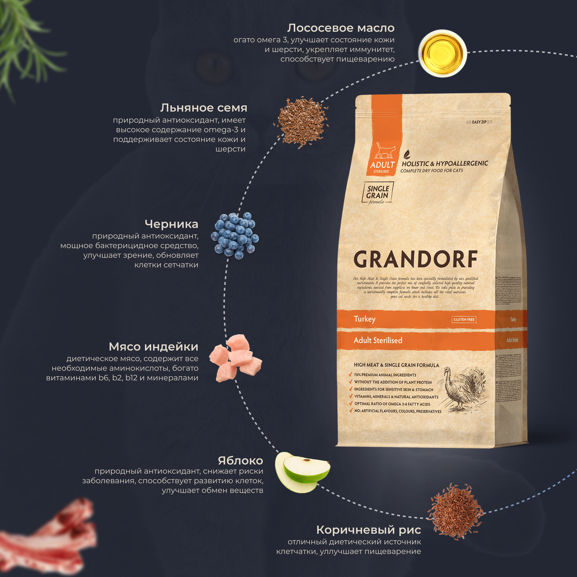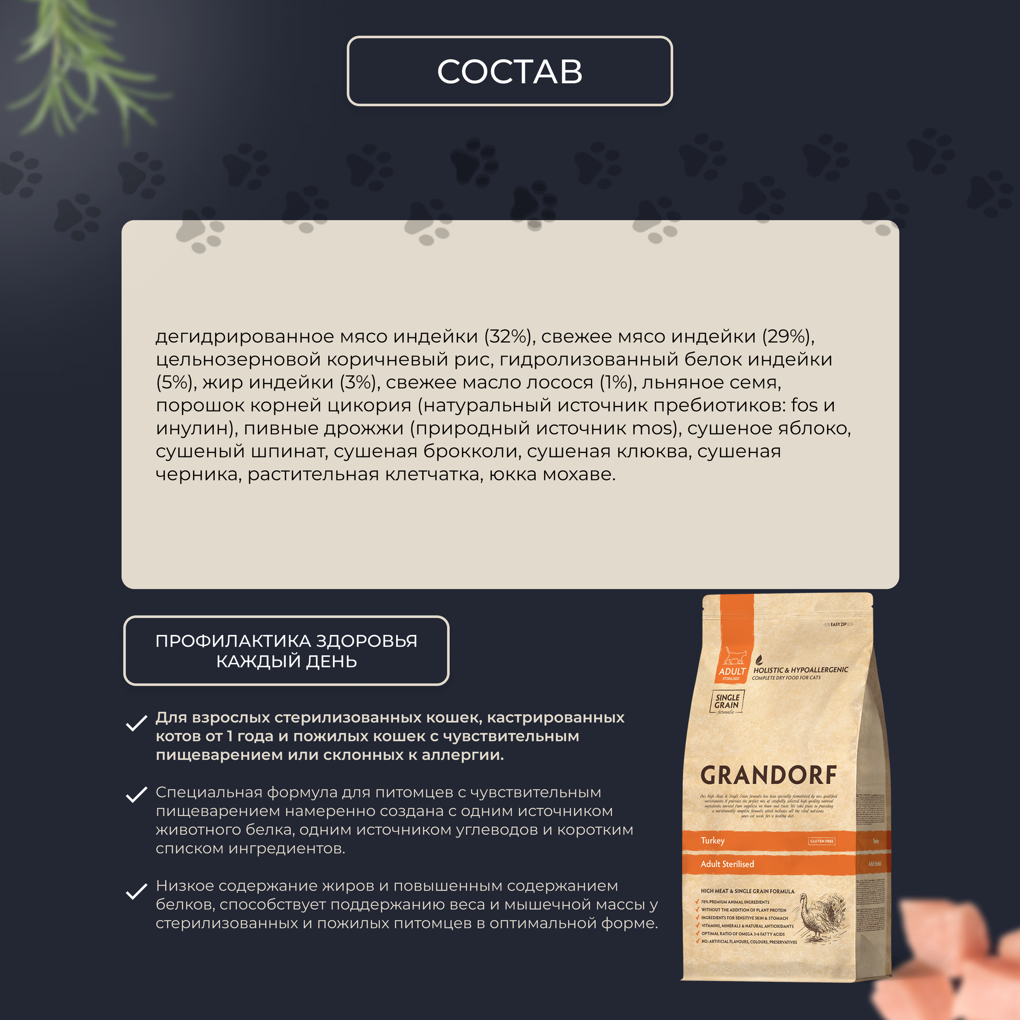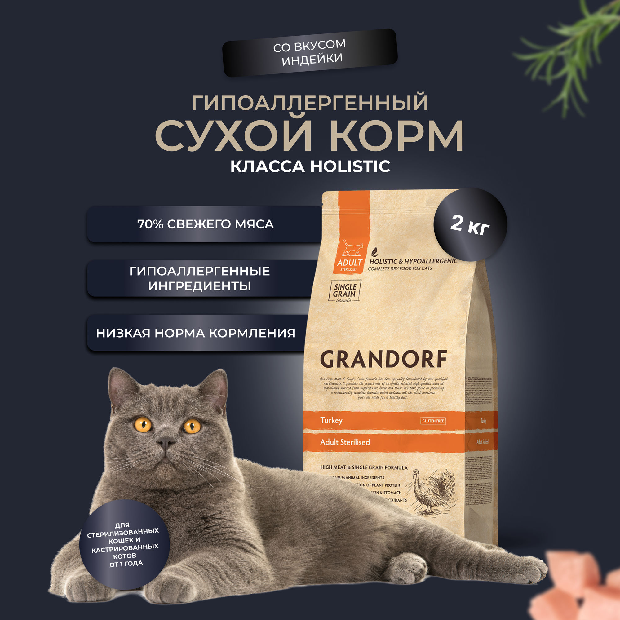 Корм сухой Grandorf Fresh , беззерновой с живыми пробиотиками, свежее мясо индейки с бататом для стерилизованных кошек, 2 кг