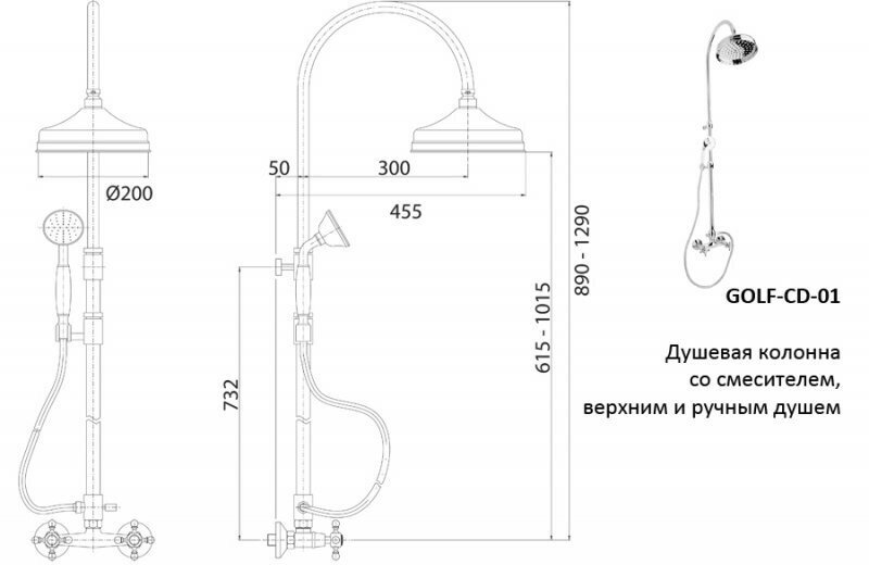 | Дополнительная информация | высота стойки для душа: 1290 мм; диаметр душевой лейки: 82 мм; диаметр верхнего душа: 200 мм |
