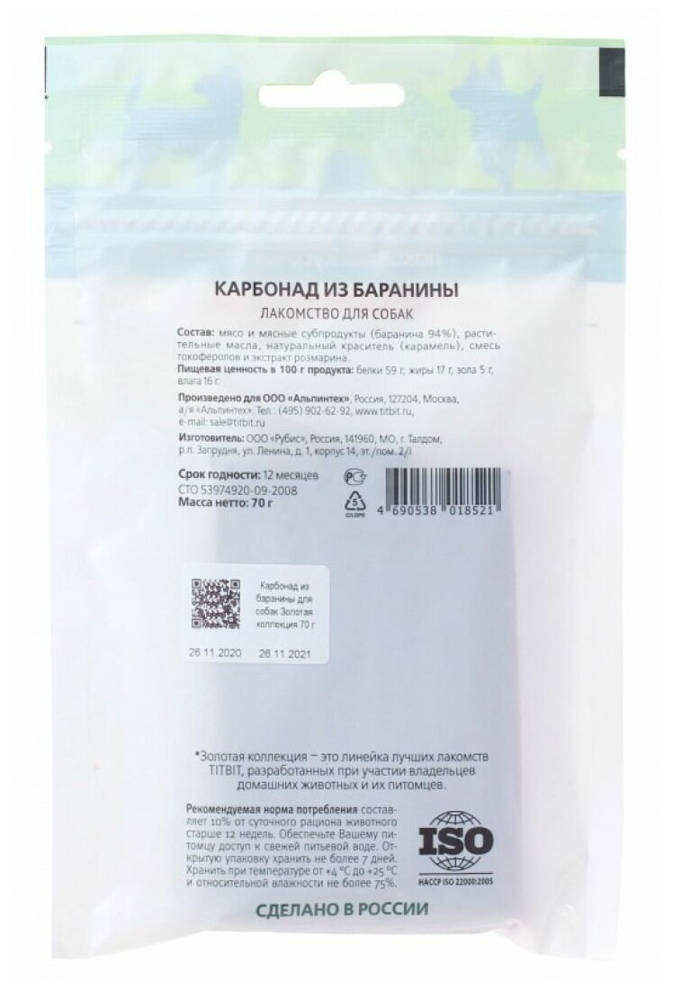 Золотая коллекция Карбонад из баранины для собак Титбит 70г