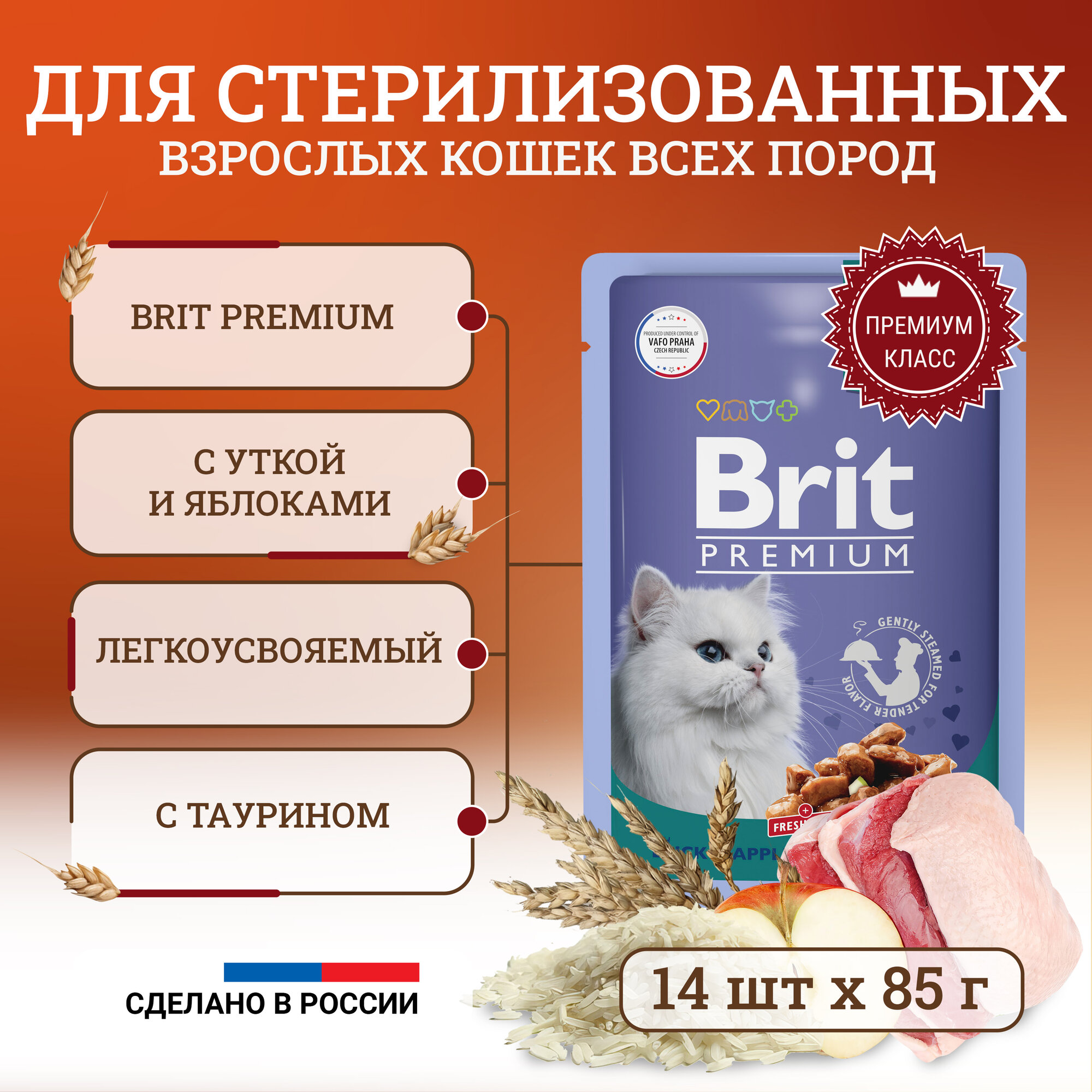 BRIT PREMIUM Паучи для взрослых стерилизованных кошек Утка с яблоками в желе, 14 шт.*85г