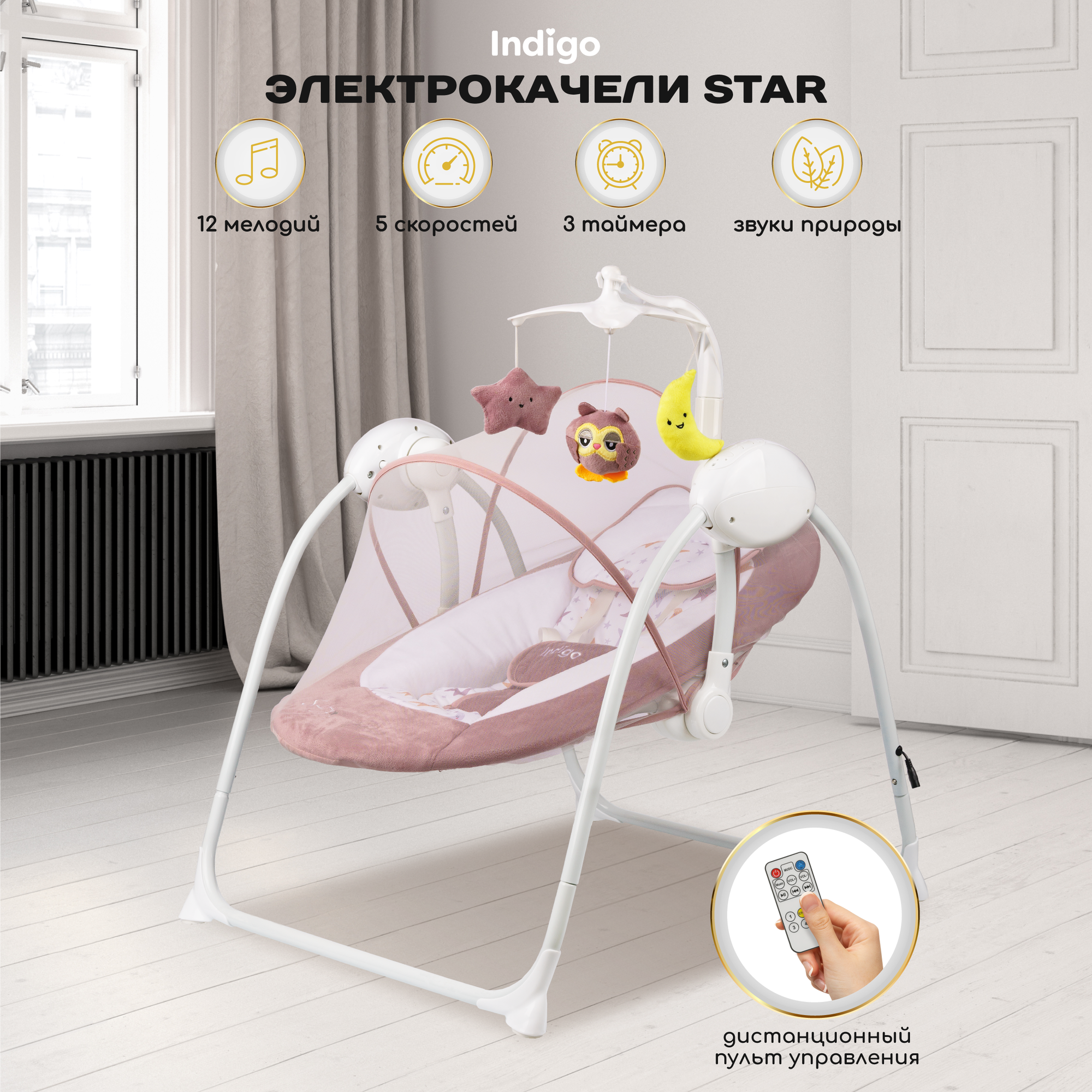 Электронные качели STAR (0-9 кг), с адаптером, п/у, 12 мел., 5 скоростей, москитка (упак.1 шт.)(Indi