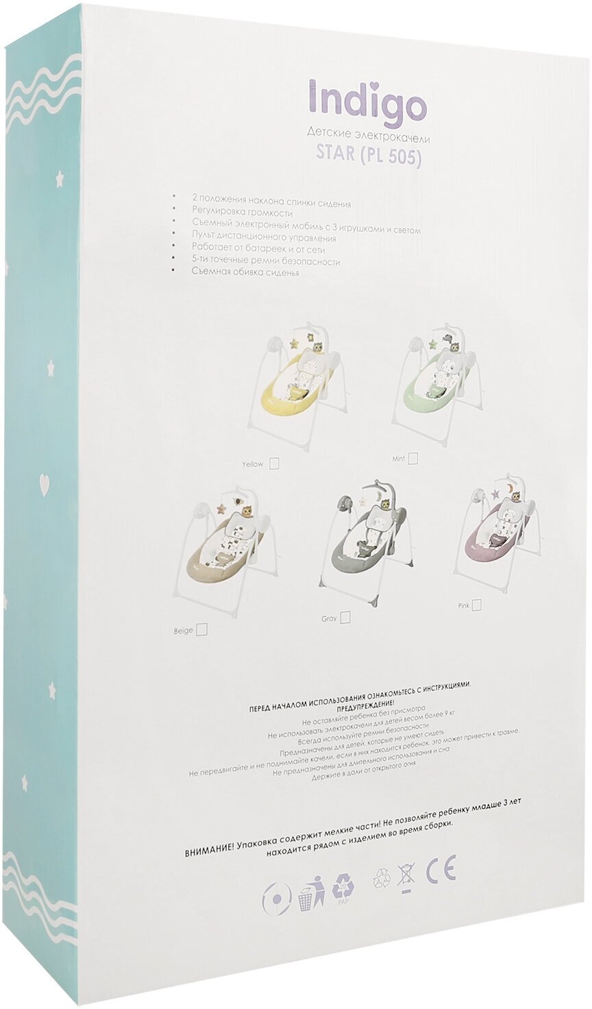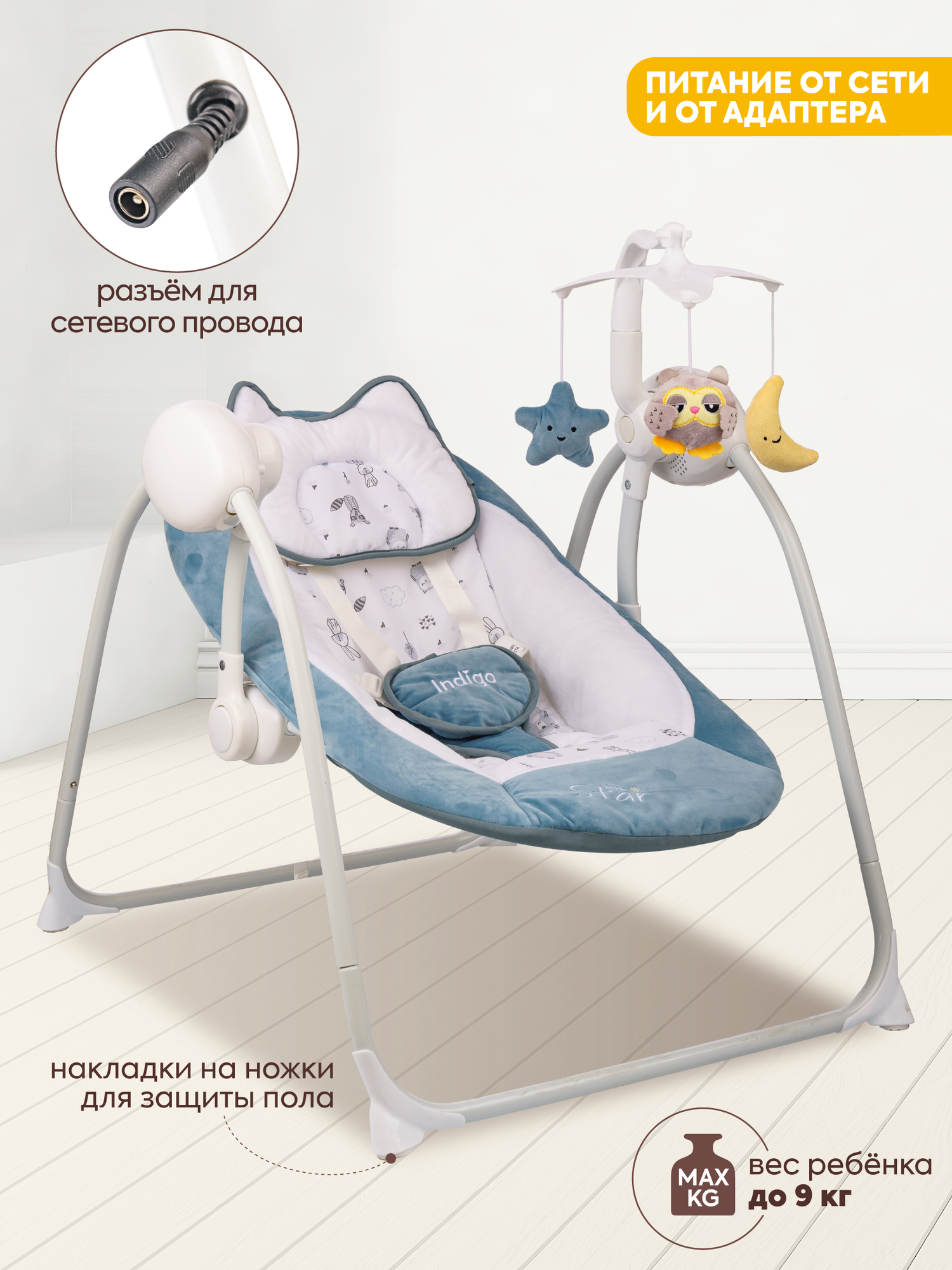 Электронные качели Indigo STAR (0-9 кг), с адаптером, п/у, 12 мелодий, 5 скоростей, москитка, мятный
