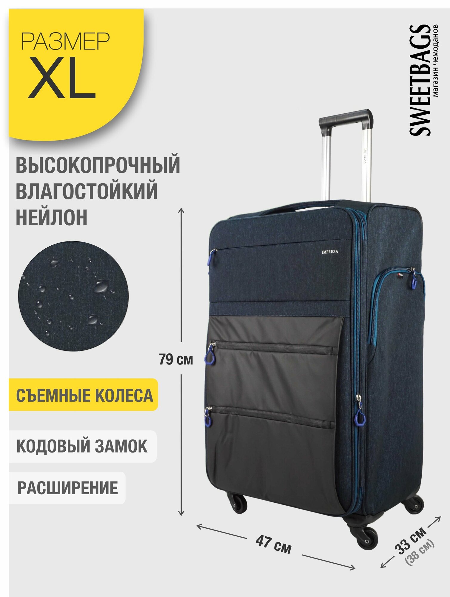 СохранитьЧемодан Sweetbags текстильный большой с 4 съемными колесами и расширением (waterproof) темно-синий XL интересное:
