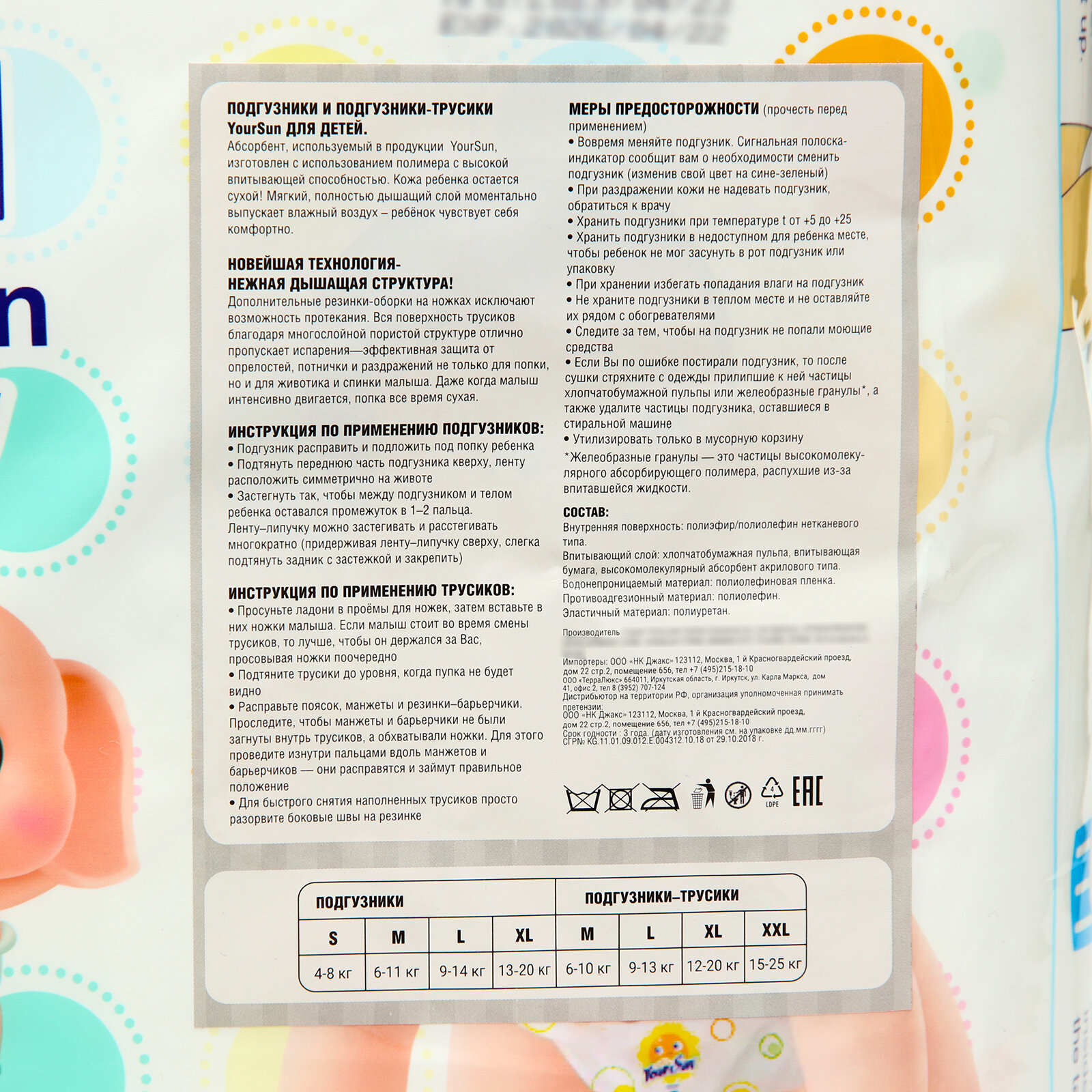 | Комплектация | YourSun трусики M (6-10 кг), 44 шт. |