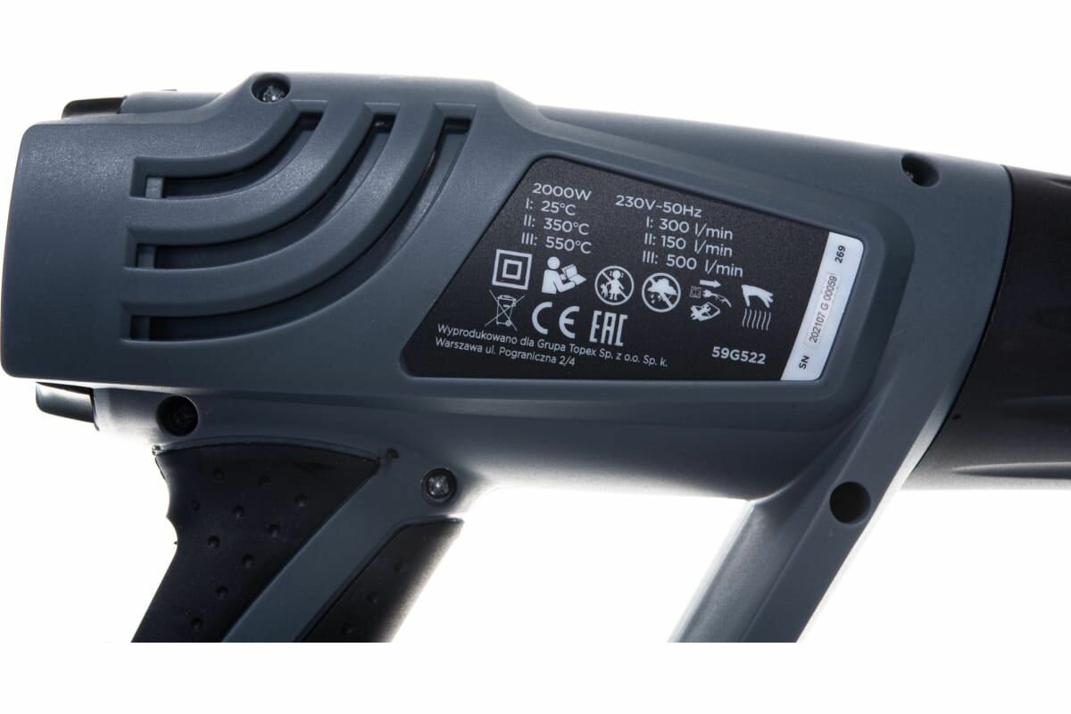 | Дополнительная информация | 3 режима работы - 25 °C, 150 л/мин; 350 °C, 300 л/мин; 550 °C, 500 л/мин; антискользящая рукоятка; возможность вертикального положения; скребок |
