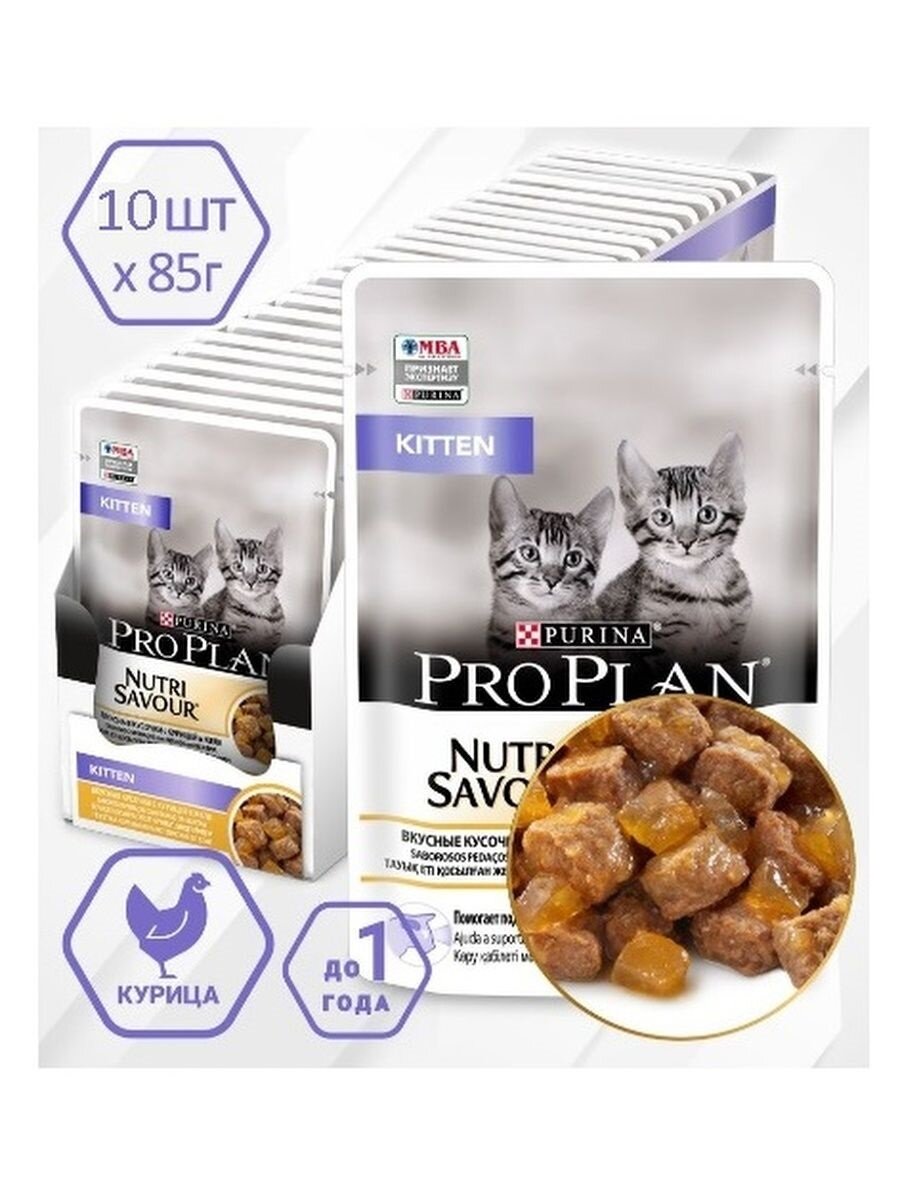 Влажный корм для котят Pro Plan Nutrisavour, с курицей 10 шт. х 85 г (кусочки в желе)