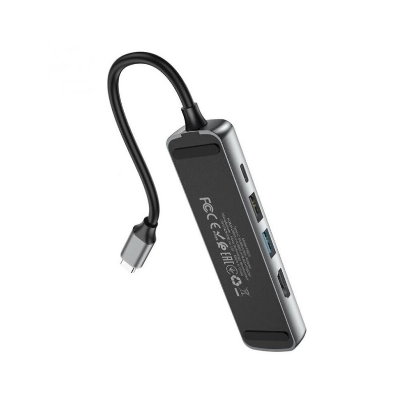 USB Хаб (HB23) c 1 Type-C на HDMI+USB3.0+USB 2.0+RJ45+PD, HOCO, металлический серый