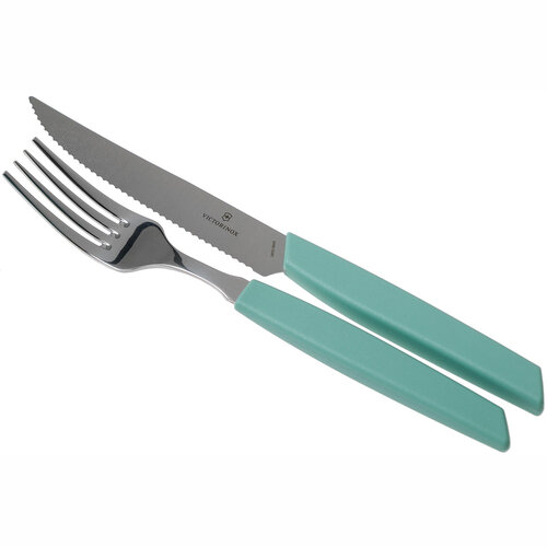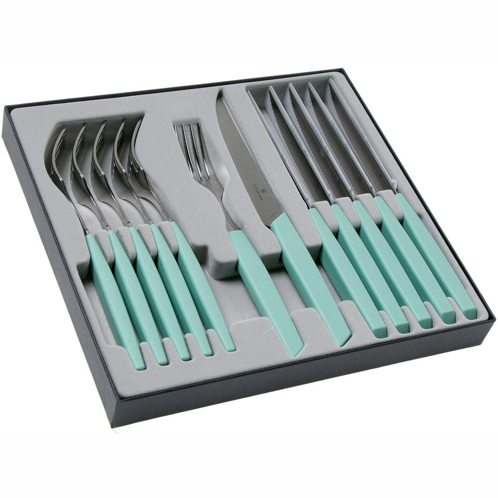 Набор из 12 столовых принадлежностей VICTORINOX Swiss Modern: 6 ножей для стейка и пиццы с волнистым лезвием 12 см, 6 столовых вилок 20,5 см, мятно-зелёный 6.9096.12W41.12