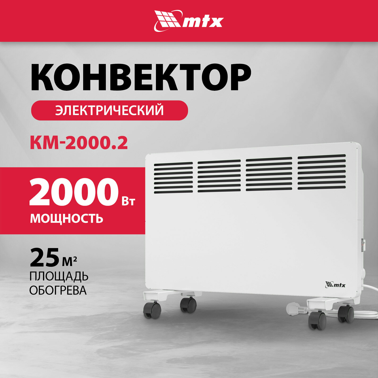 Электрический конвектор MTX КМ-2000.2, 230в, 2 квт, x-образный нагреватель, колеса, термостат 98126