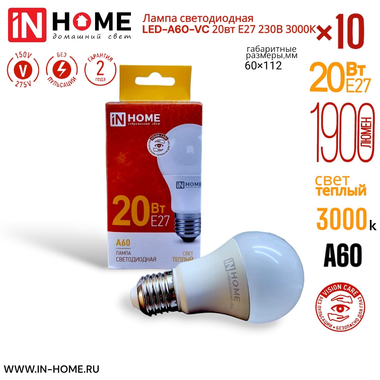 Лампа светодиодная IN HOME LED-A60-VC (4690612020297), E27, A60, 20 Вт, 3000 К