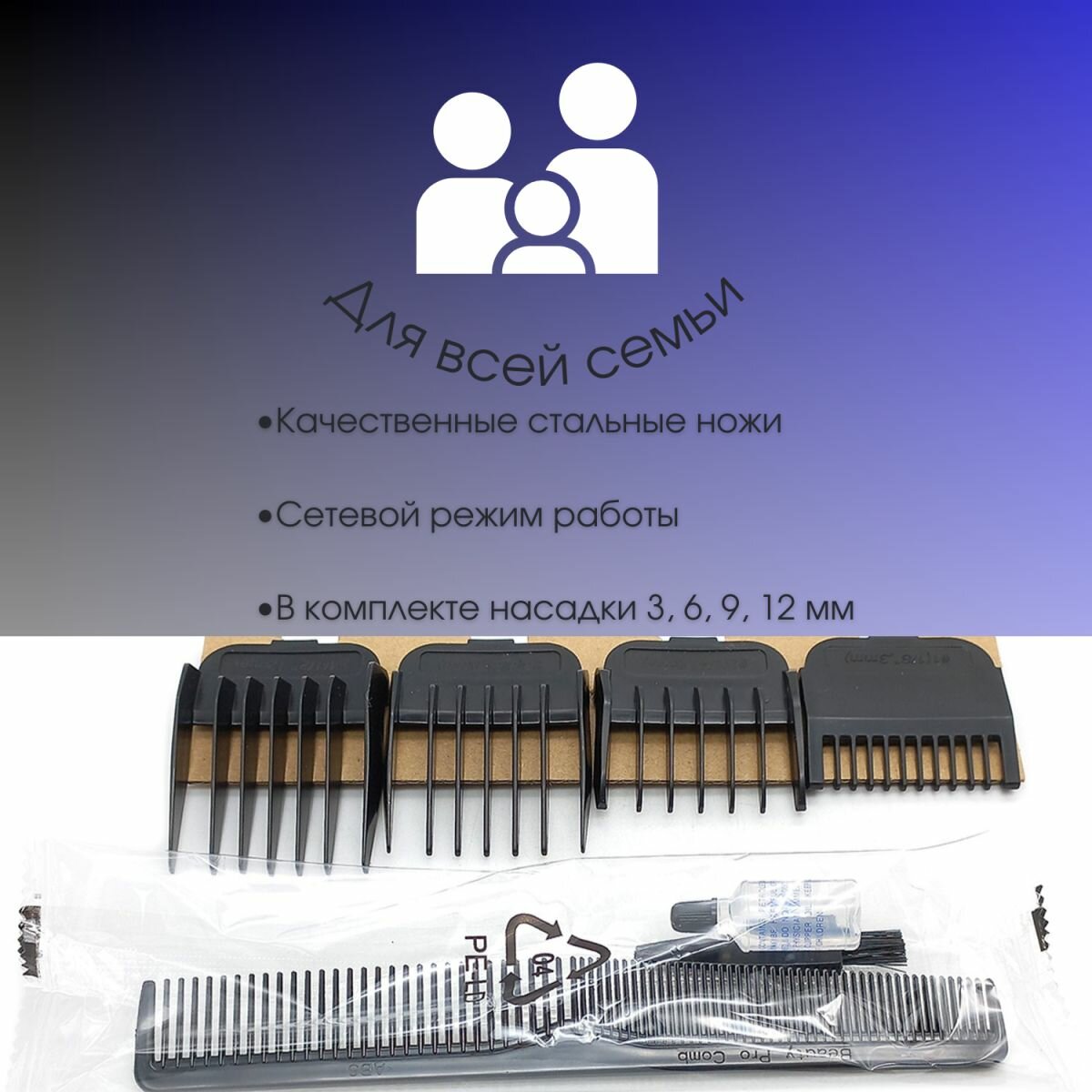 Машинка для стрижки 10ВТ сеть 4 насадки (3,6,9,12ММ) сталь ножи бердск
