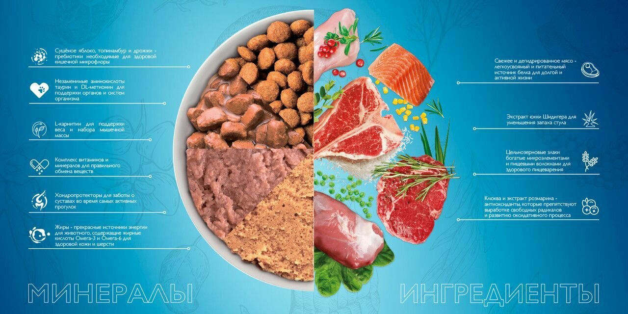 | Состав | дегидрированное мясо курицы 37 %, кукуруза, рис, свекольная пульпа, жир куриный, гидролизованная и дегидратированная печень 3 %, яблоко, дрожжи(источник маннанолигосахаридов), витаминно-минеральный комплекс, таурин, топинамбур (источник фруктоолигосахаридов), клюква, антиокислитель,L-карнитин, экстракт юкки Шидигера, экстракт розмарина |