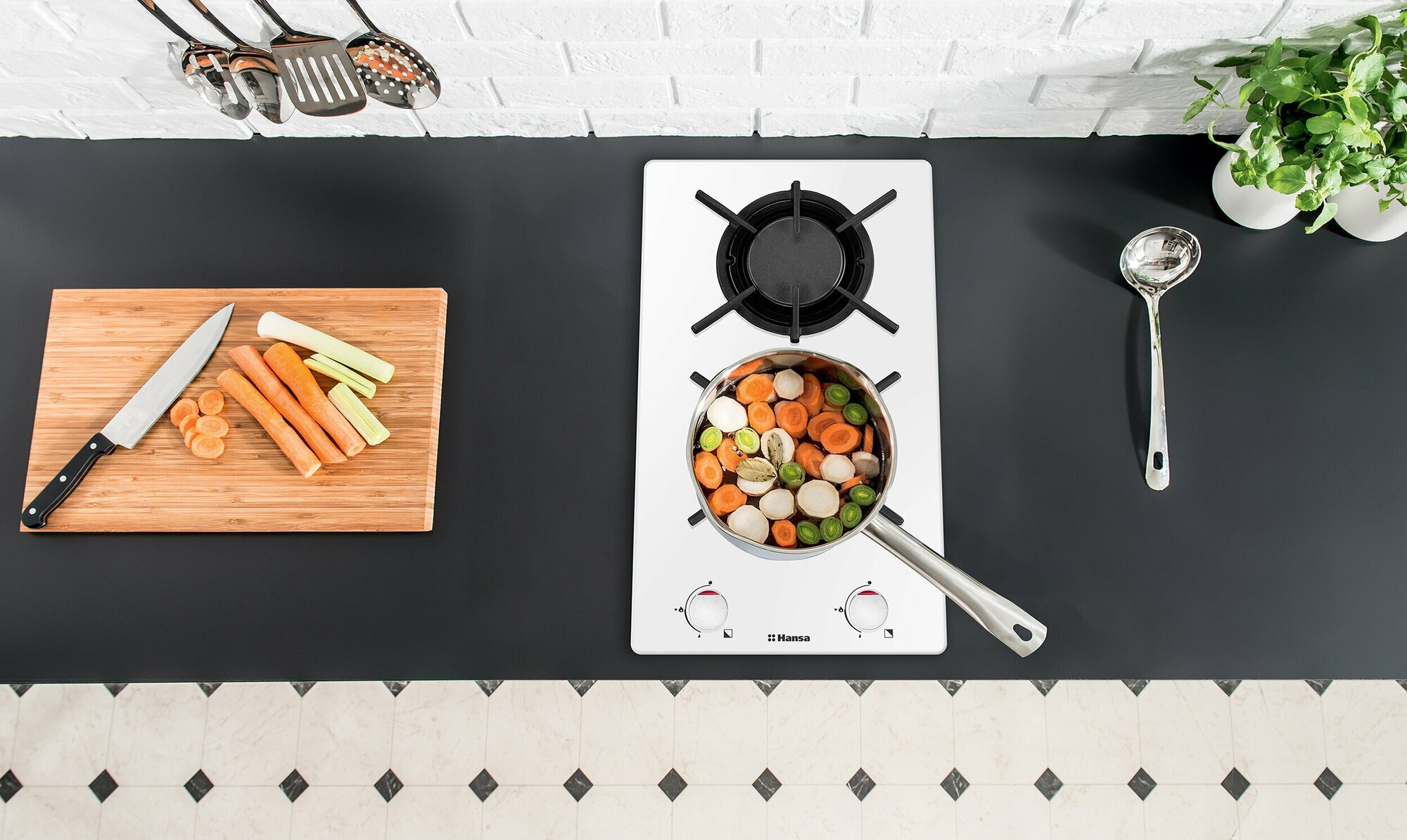 Газовая варочная панель Hansa BHKW310300, встраиваемая, 30 см, 2 конфорки, газ-контроль и автоподжиг, чугунные решетки, стеклянная поверхность